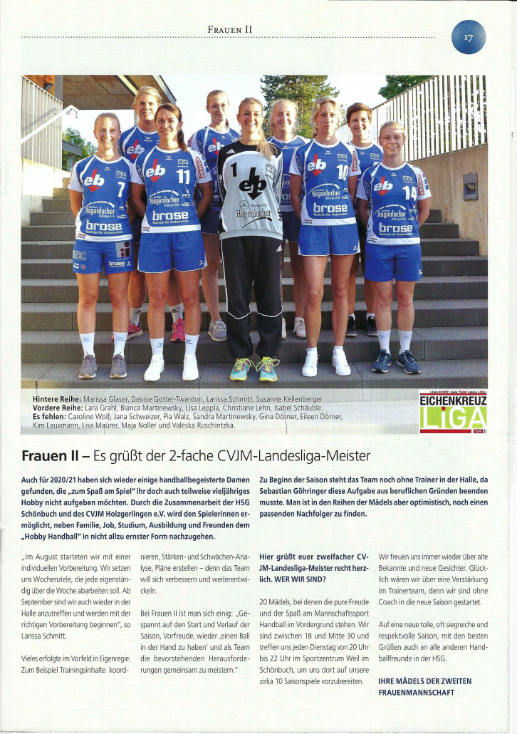 Jacqueline Neumann, Marina Maurer, Jacqueline Wenczel, Mara Dieterle, Jule Schulte, Marie Güntert, Marina Klenk, Sina Gehringer, Anna Ludwig, Pauline Dieckmann, Stefanie Fröhlich, Jana Winter, Carina Janning, Eileen Dörner, Helen Böhm, Jamie Becker, Linda Steimle, Mareike Lesch, Melina Gehring, Shoshana Jauss und Co-Trainer Jens Bayer